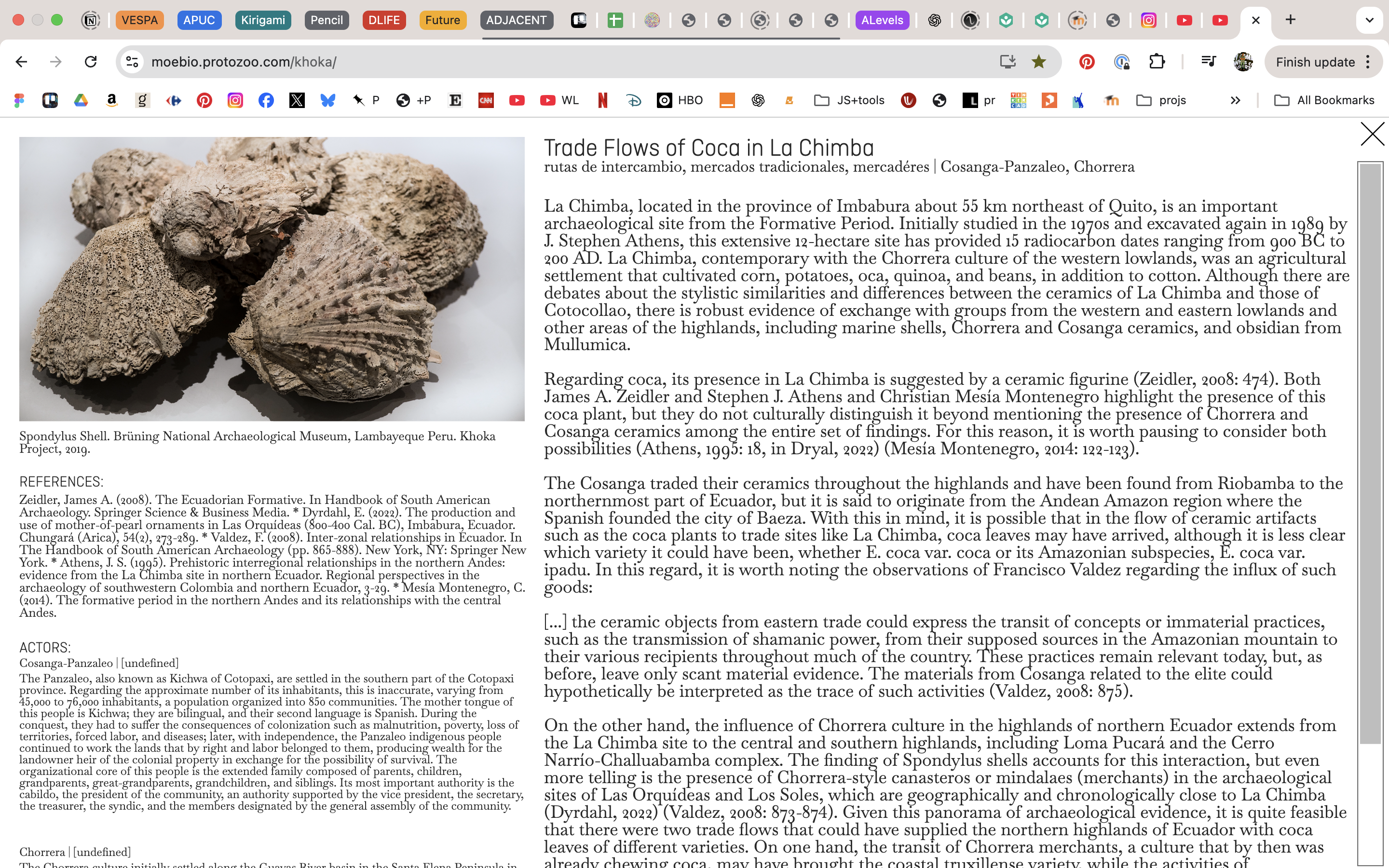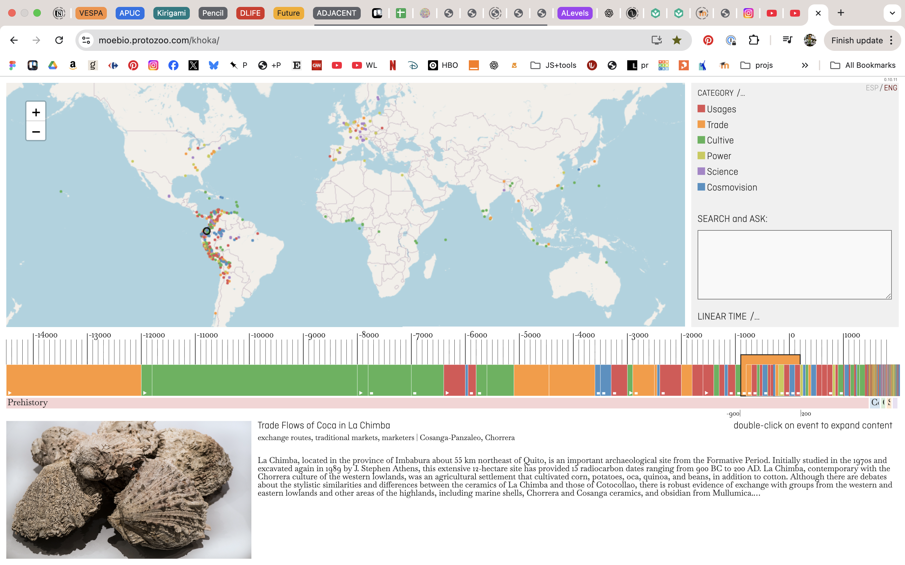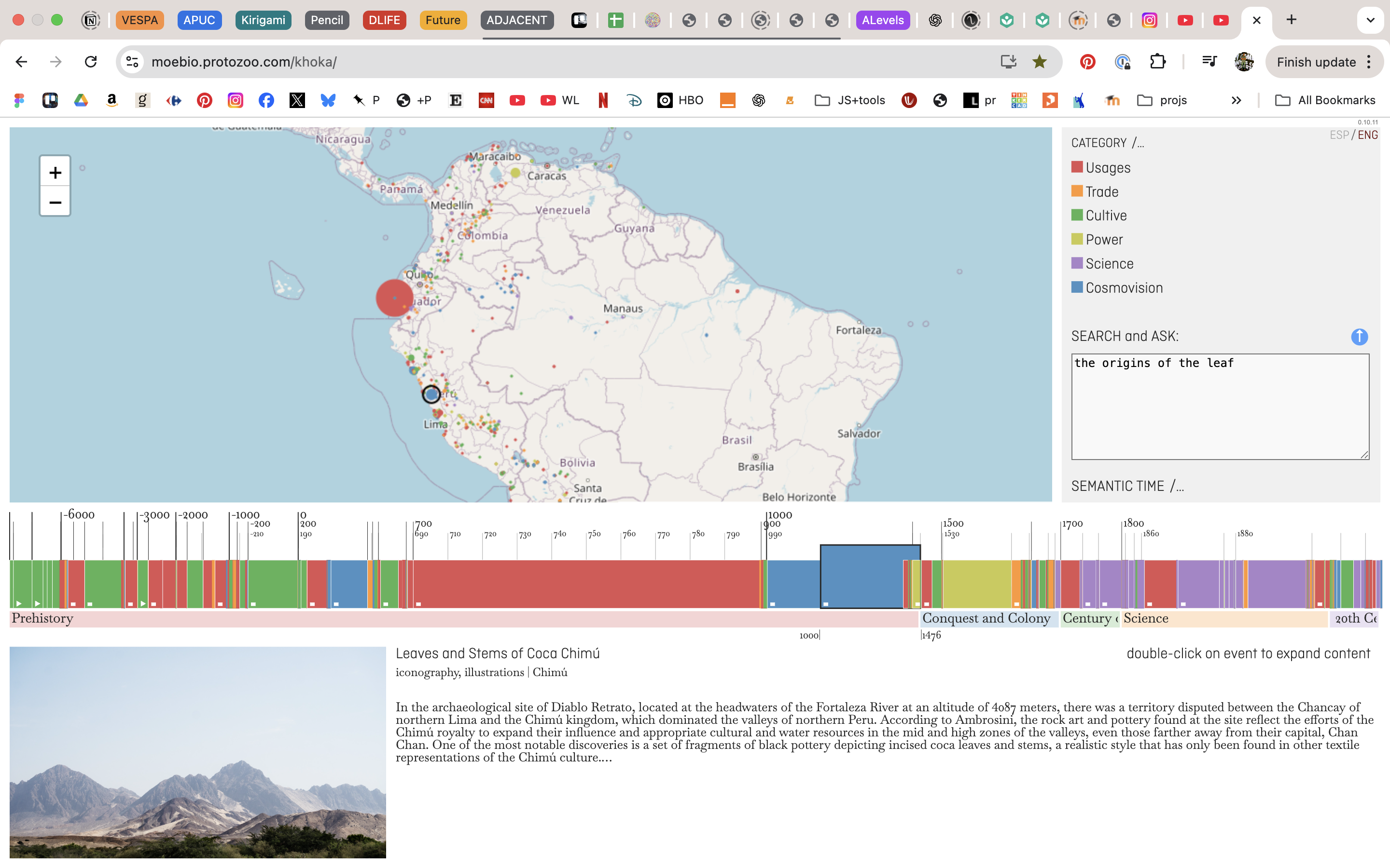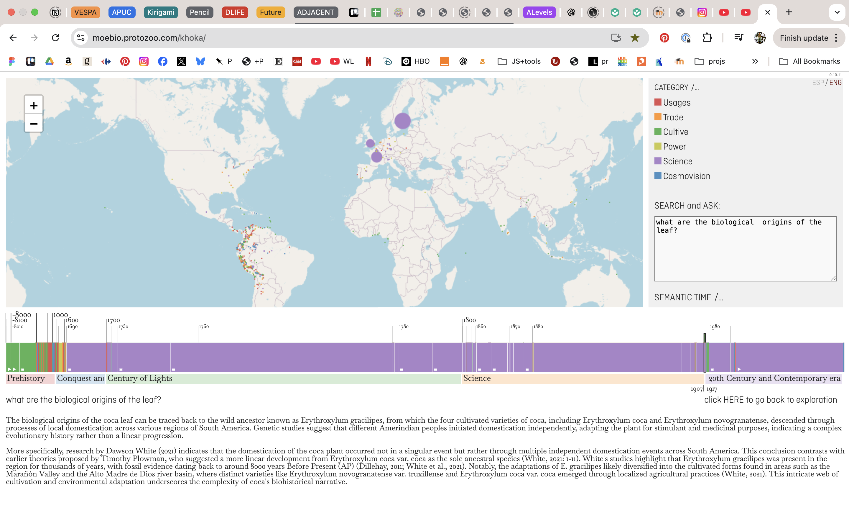 The Khoka Archive interactive system visualises a large and rich corpus of information about the Coca plant (history, mythology, chemistry, botanics, ethnobotanic, news…) assembled by a team of researchers and artists, , after several years of work. The archive contains texts, images, videos, chronological and geographical data. The environment allows for navigating the archive from multiple dimensions: a timeline, a map, and a semantic exploration tools. Visitors, frequently researchers, can ask any question about the plant and its rich history and culture, and get an answer based on the information contained on the archive. It's an example of usage of AI for data exploration, enabling anyone to perform rich exploration over a complex dataset.